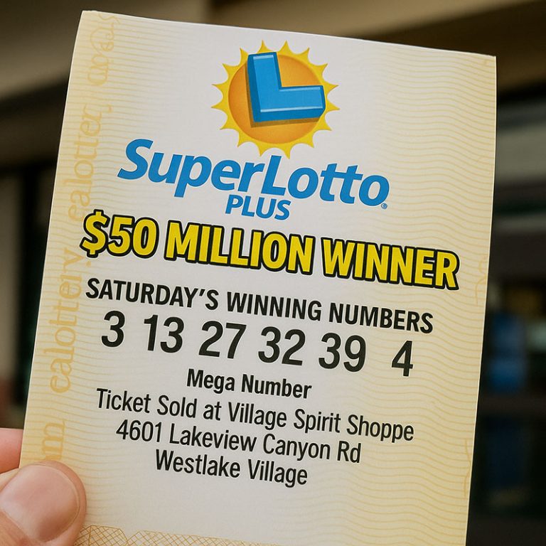 پیام جوان: به گزارش لاتاری کالیفرنیا، یکی از ساکنان این ایالت موفق شده است با تطبیق هر شش عدد در قرعه‌کشی سوپِرلاتو پلاس شنبه‌شب، جایزه بزرگ ۵۰ میلیون دلاری را از آن خود کند. اعداد برنده این دوره ۳، ۱۳، ۲۷، ۳۲، ۳۹ و مگا نامبر ۴ اعلام شدند. بلیت خوش‌شانس در فروشگاه Village Spirit Shoppe واقع در شهر وست‌لیک ویلیج فروخته شده و این فروشگاه نیز بابت فروش بلیت برنده، پاداش ۲۵۰ هزار دلاری دریافت خواهد کرد.