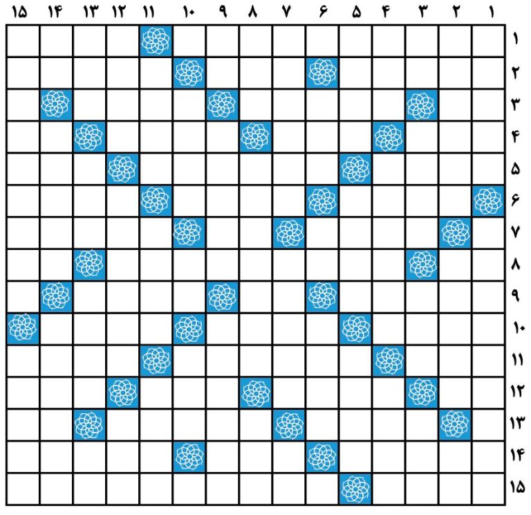 افقی: 1- کارآفرین و کارخانه ‌ دار ایرانی در سالیان نه ‌ چندان دور که نقش مهمی در تولید لوازم خانگی در ایران و کشورهای همسایه داشت- یکی از قدیمی ‌ ترین روستاهای استان فارس که بقایای آثاری از دوران هخامنشی در آن به ‌ جا مانده ‌ است 2- برابر و مساوی- سخت ‌ تر و شدیدتر- فیلمی محصول سال 1965 به کارگردانی «آلفرد هیچکاک» 3- مخفف تهی- بسیاری و فراوانی- انتقام ‌ گیرنده 4- راز نهفته- سستی و نااستواری- گماشته- صدای درشت 5- هم ‌ اکنون- محکم و استوار- کرمکی که جامه ‌ ی ابریشمین و کاغذ را بخورد و ضایع کند 6- گریزنده و فرارکننده- فقدان حس باصره- دوستی و همدمی 7- روایت ‌ کننده- تابش و فروغ- کتابی از «جووانی بوکاچیو» نویسنده ‌ ی معروف ایتالیایی 8- مرکز ناحیه ‌ ی بروتانی در فرانسه- ادیب، فیلسوف و شاعر معروف اسپانیایی و نویسنده ‌ ی کتاب «حیات عقل»- کسی که قوت سامعه نداشته باشد 9- از قمرهای شناخته شده ‌ ی سیاره ‌ ی زحل که در سال 1966 کشف شد- رده- تجزیه شده 10- پاک ‌ تر و مقدس ‌ تر- کفن ‌ دزد- تاریخ ‌ نویس 11- پسندیده و نیکو- از آثار تاریخی ایران مربوط به دوره ‌ ی تیموریان که مدرسه ‌ ای قدیمی در شهر مشهد است- اداره کل ملی هوانوردی و فضا در آمریکا 12- گرداگرد دهان- لباس و جامه- درِ بزرگ- روز دوازدهم از هر ماه خورشیدی در ایران قدیم 13- نوعی پارچه ‌ ی نخی مانند اطلس- عنوان نیروهای بین ‌ المللی کمک به امنیت در افغانستان که در سال 2001 موجودیت پیدا کرد- رخ و چهره 14- کشتی جنگی معروف امپراتوری ژاپن که در سال 1890 ساخته شد و در تمام نبردهای بزرگ ژاپن مورد استفاده قرار گرفت- بخشش و کَرَم- پستانداری کوچک ‌ تر از گربه از راسته ‌ ی جوندگان با دُمی دراز و پُرمو 15- خودداری کردن از پرداخت وجه حواله و برات و امثال آن- از داستان ‌ های معروف شاهنامه فردوسی که بر اساس آن کیکاووس و همراهانش از بند رهایی یافتند.