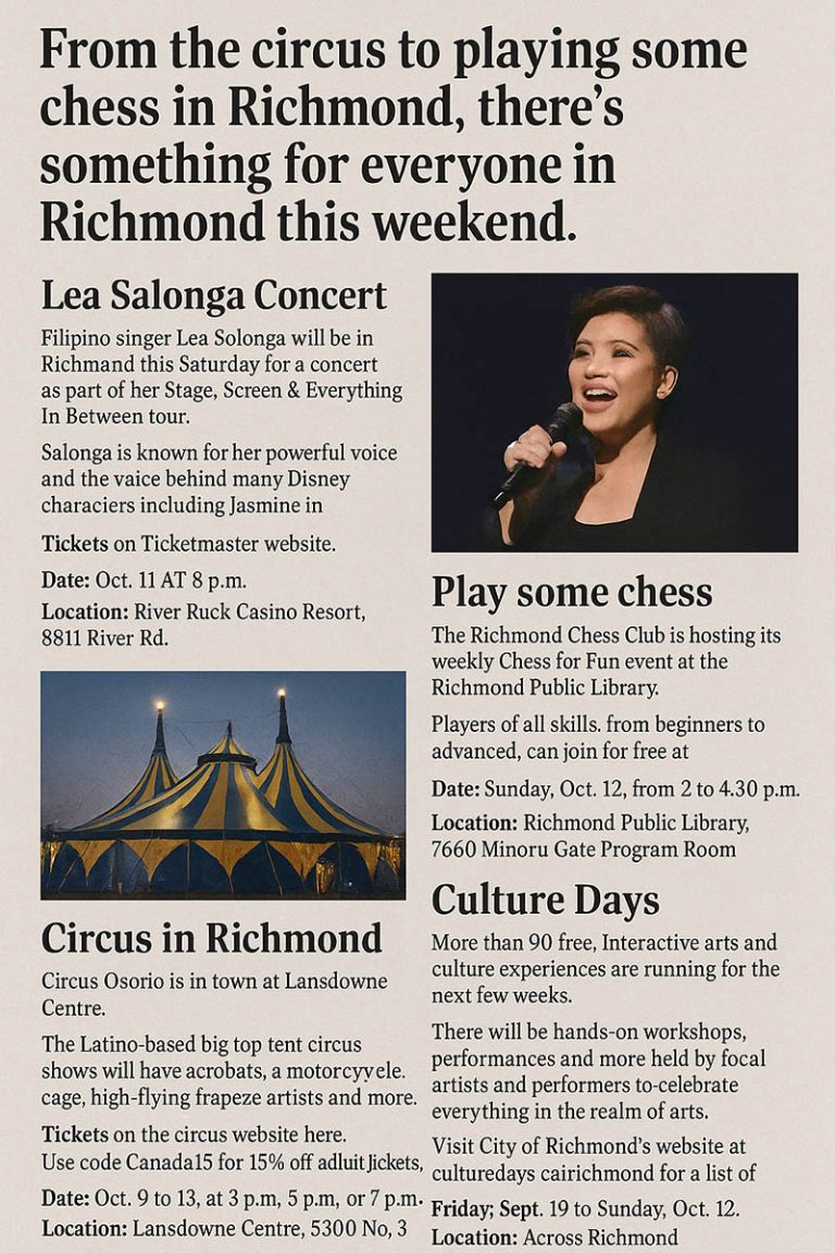 پیام جوان: به گزارش ونکوور ایز آوسوم، در ریچموند، این آخر هفته برنامههای متنوعی برای علاقهمندان به هنر، ورزش و سرگرمی تدارک دیده شده است. کنسرت لیا سالونگا، خواننده مطرح فیلیپینی و صداپیشه کاراکترهای محبوب دیزنی، روز شنبه در River Rock Casino Resort برگزار میشود که بلیتهای آن از طریق Ticketmaster قابل تهیه است.