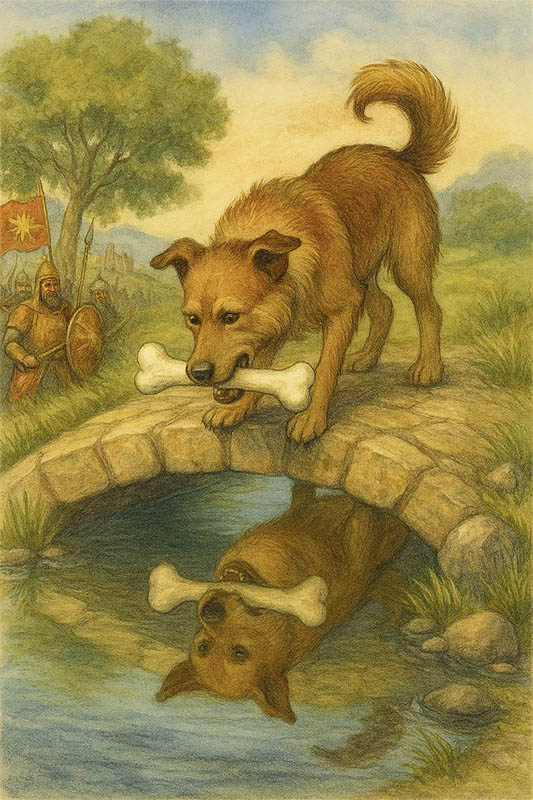 روزی سگی گرسنه و نحیف، بر لب جویی میرفت که از عطش و رنج، صدای پایش به زحمت شنیده میشد. ناگاه در گل و شن، استخوانی یافت، کهنه و بیمغز، لیک برای او چون گنجی پنهان. آن را به دندان گرفت و به کنج آرامی رفت تا در سایه بنشیند و لذت خویش برد. اما چون به پل کوچکی رسید که از روی آب میگذشت، در جوی نگریست و تصویری از خود دید؛ سگی دیگر، استخوانی دیگر، گویی بزرگتر و لذیذتر. حرص بر او چیره شد و گفت: «آن استخوان از این بهتر است، آن را باید از چنگ او برآورم!»
