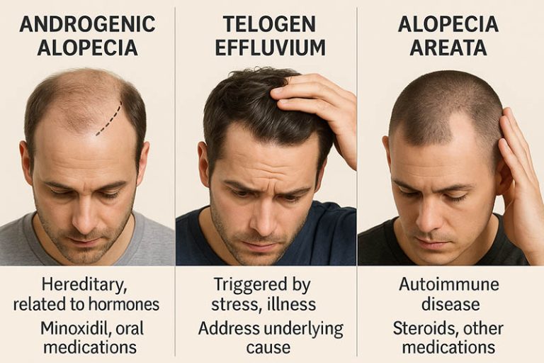 آلوپسی آندروژنتیک (الگوی مردانه و زنانه): این نوع ریزش مو که شایعترین نوع محسوب میشود، ریشه ژنتیکی دارد و ناشی از حساسیت فولیکولهای مو به هورمونهای آندروژن است. در مردان، این عارضه به شکل عقبنشینی خط مو و نازک شدن در ناحیه تاج سر بروز میکند، در حالی که در زنان معمولاً به صورت نازک شدن منتشر در سر است و خط مو حفظ میشود. درمانهای اصلی برای این نوع شامل ماینوکسیدیل موضعی، فیناستراید خوراکی (برای مردان) و گاهی اوقات اسپیرونولاکتون (برای زنان) است که همگی با هدف کند کردن تأثیر هورمونی و تقویت رشد فولیکولهای باقیمانده عمل میکنند.