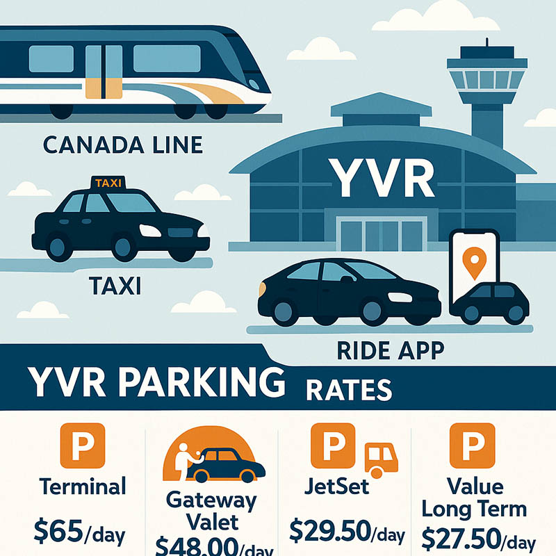 پارکینگ ترمینال که به ساختمان فرودگاه متصل است، راحتترین اما گرانترین گزینه است؛ ۳۰ دقیقه اول رایگان بوده و هر ۳۰ دقیقه اضافه ۱۴ دلار محاسبه میشود، با حداکثر روزانه ۶۵ دلار. گزینههای دیگر شامل Gateway Valet (۲۸ دلار در ساعت به همراه ۲۰ دلار هزینه خدمات)، JetSet Parking (۲۹.۵۰ دلار روزانه یا ۱۴۱ دلار هفتگی) و Value Long Term Parking (۲۷.۵۰ دلار روزانه یا ۱۵۳.۵۰ دلار هفتگی) است. این گزینه آخر نزدیک ایستگاه تمپلتون کانادا لاین قرار دارد و بهصرفهترین انتخاب برای اقامت طولانی محسوب میشود.