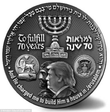 ترامپ، در تصمیمی تاریخی، اورشلیم را به عنوان پایتخت اسرائیل به رسمیت شناخت. این اقدام، نه تنها سیاستی جسورانه بود، بلکه برای بسیاری از یهودیان و دوستداران اسرائیل، تجلی اراده ی خداوند بود. اسرائیل، با ضرب سکه ای که تصویر کوروش و ترامپ را در کنار هم نشان می دهد، این پیوند را به صورت نمادین ثبت کرد — سکه ای با منورا، شیر داوود، مهر ایالات متحده، و جمله ای از کتاب مقدس: «و او مرا مأمور ساخت تا خانه ای برایش در اورشلیم بنا کنم.»