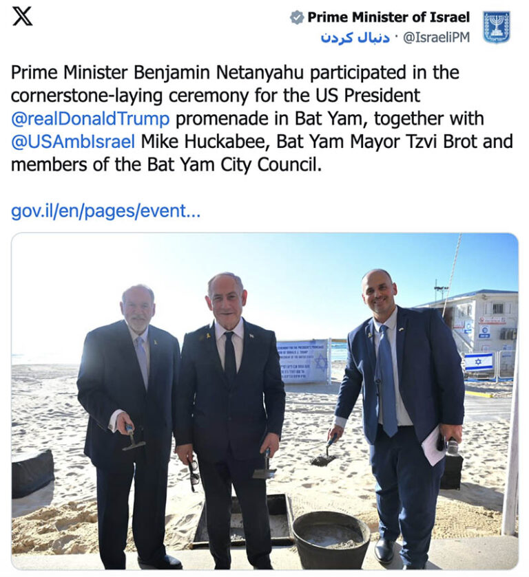 پیام جوان: بنیامین نتانیاهو، نخستوزیر اسرائیل، به همراه مایک هاکبی، سفیر آمریکا در این کشور، روز چهارشنبه در مراسم آغاز ساخت یک تفرجگاه ساحلی در شهر باتیام شرکت کرد. این پروژه به نام دونالد ترامپ، رئیسجمهوری آمریکا، نامگذاری شده است. شهردار باتیام و اعضای شورای شهر نیز در این مراسم حضور داشتند.