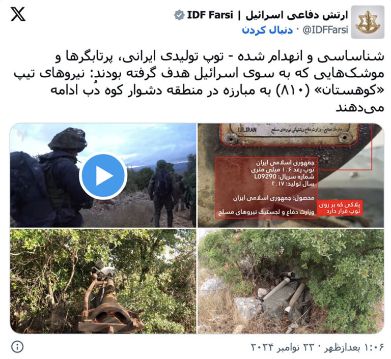 پیام جوان: ارتش اسرائیل روز شنبه سوم آذر از شناسایی و انهدام توپ، راکت‌انداز، و راکت‌های ساخت حکومت ایران در جنوب لبنان که از سوی شبه‌نظامیان حزب‌الله، گروه تحت حمایت جمهوری اسلامی ایران، استفاده می‌شدند، خبر داد.
