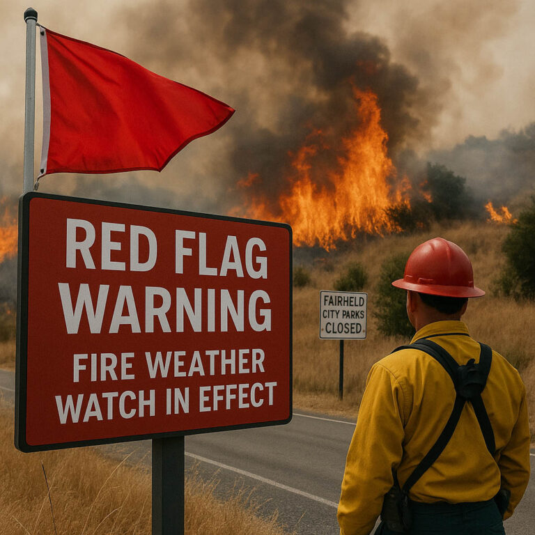 پیام جوان: به گزارش ان بی سی بی اریا، سرویس ملی هواشناسی هشداری با عنوان «پرچم قرمز» برای روزهای یکشنبه و دوشنبه به دلیل خطر بالای آتش‌سوزی در شهرستان سولانو و دره‌های ساکرامنتو و سن خواکین صادر کرد. این هشدار به دلیل بادهای شمالی با سرعت ۱۵ تا ۲۵ مایل در ساعت، تندبادهای تا ۳۵ مایل در ساعت و رطوبت پایین (۱۵ تا ۲۵ درصد در روز) اعلام شد. مقامات توصیه کردند که سوزاندن زباله متوقف شود، اقدامات ایمنی رعایت گردد و برنامه اضطراری آماده شود. در فیرفیلد، پارک‌ها بسته شدند و آتش‌نشانان در حالت آماده‌باش قرار گرفتند.