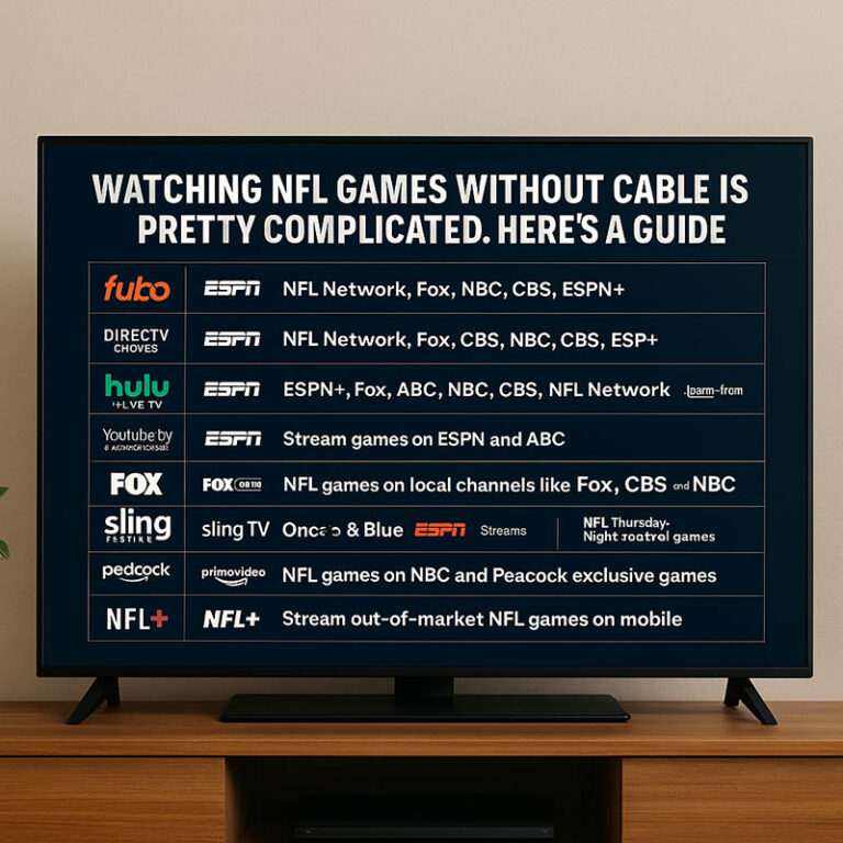 در میان گزینهها، سرویسهایی چون Fubo، DirecTV Choice، Hulu + Live TV و YouTube TV + Sunday Ticket پوشش گستردهای از شبکههای ESPN، NFL Network، Fox، CBS و NBC را ارائه میدهند. گزینههای تخصصیتر مانند Amazon Prime Video با تمرکز بر Thursday Night Football یا Peacock برای پخش اختصاصی NBC، مکمل این بستهها هستند. همچنین، استفاده از یک آنتن HD همچنان امکان تماشای رایگان بازیهای محلی از شبکههای CBS، NBC و Fox را فراهم میسازد.