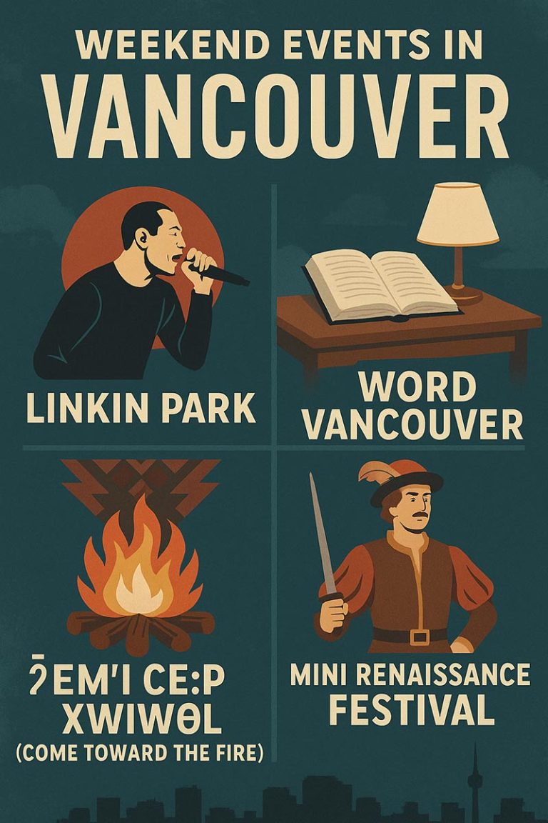 پیام جوان: به گزارش ونکوور ایز آوسوم، با وجود خنکتر شدن هوا، آخر هفته پیشِرو در ونکوور مملو از رویدادهای متنوع فرهنگی، هنری و ورزشی است. از جشنواره بومی «به سوی آتش بیا» در دانشگاه UBC گرفته تا نمایشگاه کوچک رنسانس در میشن و جشنواره ادبی رایگان Word Vancouver در مرکز شهر، گزینههای بسیاری برای علاقهمندان وجود دارد. علاوه بر این، کنسرتها، نمایشهای کمدی و مسابقات ورزشی نیز در برنامه قرار دارند.