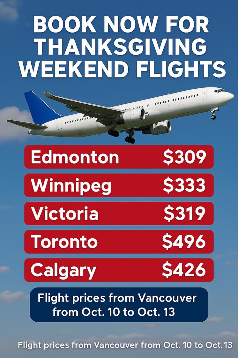 پیام جوان: به گزارش ونکوور ایز آوسوم، با نزدیک شدن به تعطیلات طولانی روز شکرگزاری در کانادا، قیمت بلیط‌های پرواز داخلی به‌ویژه از مبدأ ونکوور رو به افزایش گذاشته است. کارشناسان هشدار می‌دهند مسافران باید هرچه سریع‌تر بلیط‌های خود را رزرو کنند، چراکه گزینه‌های ارزان‌قیمت به سرعت در حال کاهش است. این تعطیلات از جمعه ۱۰ اکتبر آغاز و تا دوشنبه ۱۳ اکتبر ادامه خواهد داشت.