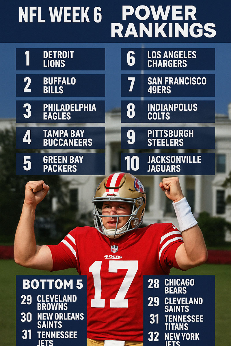 در صدر جدول، دیترویت لاینز با عملکردی مطمئن در صدر ردهبندی قدرتی هفته ششم قرار گرفت. بوفالو بیلز پس از نخستین شکست فصل به رتبه دوم سقوط کرد و فیلادلفیا ایگلز نیز با نشانههایی از افت در حمله در جایگاه سوم ایستاد. در همین حال، سانفرانسیسکو ۴۹رز با پیروزی چشمگیر برابر لس آنجلس رمز بار دیگر به جمع تیمهای برتر بازگشت و خود را بهعنوان یکی از قدرتهای جدی کنفرانس NFC معرفی کرد.