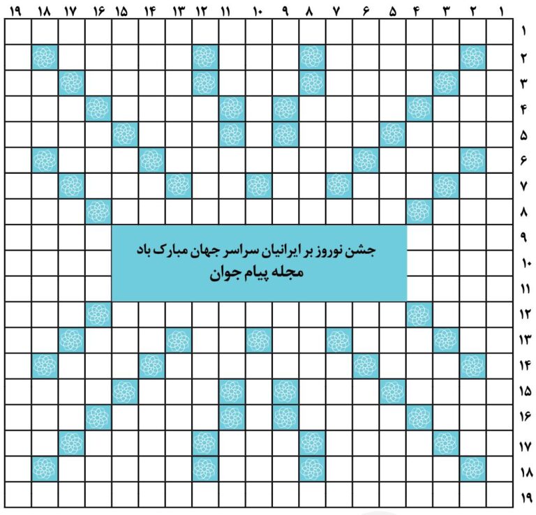 افقی: 1- کتابی از گی راشه نویسندهی معروف فرانسوی 2- پسر کورش بزرگ و ملکه کاساندان- علف و گیاه- مهمترین جشن باستانی ایرانیان 3- تنها و بیهمتا- از ارزهای دیجیتال- از جهات جغرافیایی- بهسوی خود کشنده- مروارید 4- احمر- ماشین باری کوچک- پایدار و ثابت- مظهر پلیدی 5- ارتباط تلفنی- بیرون جستن- دارای بستهبندی استوانهای- برق شمشیر 6- آیین- ادیب بزرگ ایرانی و بنیانگذار و سرویراستار دانشنامه ایرانیکا- تن 7- بهانهجویی- افزون- پسوند شباهت- سطح- مسرور گشتن- کلمهای برای نشان دادن اسف و اندوه 8- تابهی نانپزی- یک تعطیلی ملی در آمریکا و کانادا که در آمریکا در چهارمین پنجشنبه ماه نوامبر برگزار میشود- خودداری کردن 9- بزرگوارتر- زمان مرگ 10- بیگمان و بدون شک- غنیمتگیرنده 11- لاغر و نحیف- عنوان قدیمی برای قبایل سیاهپوست ساکن آفریقای شرقی 12- آدابورسوم- از زیباترین اماکن دیدنی شیراز که در زمان صفویان از گردشگاههای پادشاهان بود- عالی و برتر 13- حرف دوازدهم از الفبای یونانی- مورد و نمونه- شهری در استان انو در کشور بلژیک- مذکر- دریاچهای طبیعی در شمال غرب خرمآباد- بوی ماندگی 14- کفش چرمی ساده- دومین دودمان پادشاهی ایران- از سینهای سفره هفتسین 15- کمیاب- درخت لرزان- از حروف الفبای فارسی- سبزهی سفره هفتسین 16- بخشی از اوستا- حاکم و فرمانروا- بسیار شککننده- درختی که از دوران باستان تاکنون، نماد مهر تابان، زندگیبخش و نشانهی نامیرایی و پایداری در برابر نیروهای مرگآور بودهاست 17- تپهی بلند- شب زایش ایزد مهر- پدر و پسر رییسجمهور ایالات متحده- شوهر خواهر- حیوان بارکش 18- نوعی هیدروکربن گازی با چهار اتم کربن و قابلیت اشتعال بالا- توالی آکورد یا ریفرین در موسیقی- پیاپی وارد شدن 19- دومین نشریه فارسیزبان که اولین شمارهی آن در 18 بهمن سال 1299 خورشیدی چاپ شد.