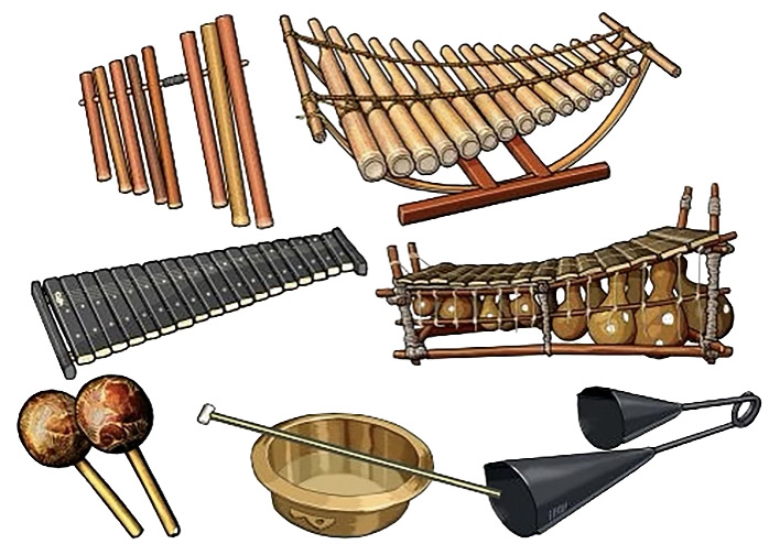 ۱۱) کلاوس: این ساز از خانواده ی آیدیوفون ها (خود صدا ها) و زیر مجموعهی سازهای کوبه ای است. منشأ این ساز، آمریکای لاتین است و از دو قطعهی استوانه ای شکل از چوب سخت تشکیل شده که هر یک حدود یک اینچ قطر و شش اینچ طول دارند. هنگام نواختن، یکی از کلاوسها بدون اعمال فشار بین انگشتان یک دست قرار میگیرد و کلاوس دیگر با دست مخالف بر آن کوبیده میشود. دستی که کلاوس را نگه داشته است، نقش جعبهی تشدید صدا (رزونانس) را ایفا میکند. این ساز عمدتاً برای اجرای الگوهای استیناتو استفاده میشود، اما در موسیقی ارکسترال نیز به منظور تقویت آکوردهای خشک (secco) به کار میرود.