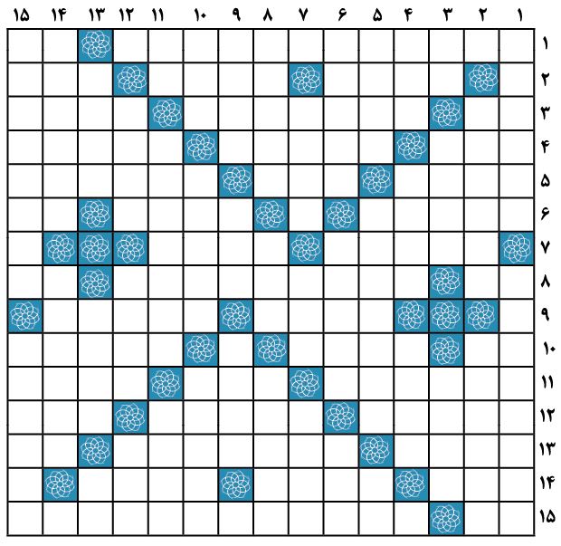 عمودی: 1- از سرداران مبارز ایران در دوران خلافت عباسیان- از اماکن طبیعی پُرجاذبه در شهرستان الیگودرز لرستان 2- اتحادیهی همکاری بین سه کشور بلژیک، هلند و لوکزامبورگ- دو روز قبل 3- باب روز- کفش لاستیکی- از ابزار ورزشی برای بدنسازی 4- آنچه بدان مریضی را چاره کنند- سبک ادبی یا هنری- جوایز و عطایا 5- رگهای بینی- ادیب بزرگ آمریکایی و نویسندهی کتاب «کمدی انسانی»- سازی که در عربی با نام دف شناخته میشود 6- روزنامهی فرانسویزبان چاپ کشور سوئیس- چهلمین رئیسجمهور ایالات متحده آمریکا- دام صیادان 7- کبوتر اهلی- درختی است که آتش هیزم آن بسیار پُردوام است- مصیبت و عزا 8- هر بخش از کتاب «وندیداد»- از تقسیمات زمان- فراخ شدن 9- اسرار- هستی و وجود- نسخهی مرورگر رسمی گوگل که برای سریع و ایمن و قابل سفارشی بودن ساخته شدهاست 10- شهری در کشور ترکیه که گربههای زیبای آن شهرت جهانی دارند- مجموعهی قطعات و ابزارهایی که برای ایجاد نیرو یا تولید چیزی تعبیه کنند- برگزیده و نخبه 11- حزن و اندوه- کوچکترین و کمجمعیتترین کشور مستقل جهان- بازیکن سابق تیم ملی فوتبال پرتغال که در پست هافبک تهاجمی بازی میکرد 12- ماهر و چیرهدست- بزرگوارتر- بن گردن 13- نقاش فراواقعگرای اسپانیایی و خالق تابلوی «تداوم حافظه»- مهمان ناخوانده- فیلم آمریکایی اکشن و دلهرهآور به کارگردانی «آنا فورستر» که در سال 2022 منتشر شد- 14- رزمنده و پیکارگر- رختکن حمام 15- پارلمان مرکزی آلمان فدرال که در شهر برلین قرار دارد- یکی از مهمترین نقاط تاریخی ایران در شهرستان گناوه که مربوط به دوران ساسانی است.