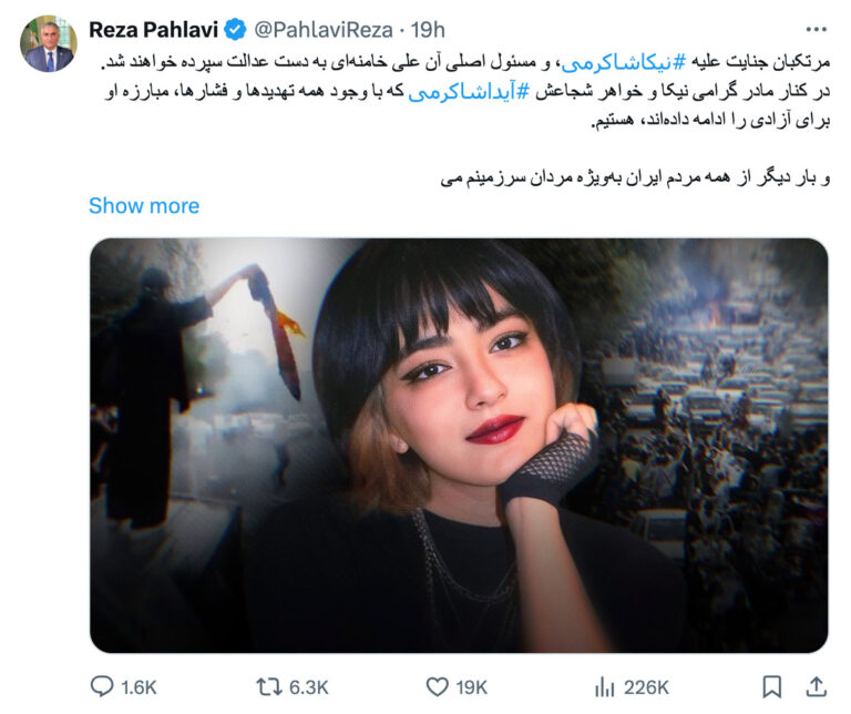 شاهزاده رضا پهلوی: مرتکبان جنایت علیه نیکا شاکرمی، و مسئول اصلی آن علی خامنه‌ای به دست عدالت سپرده خواهند شد