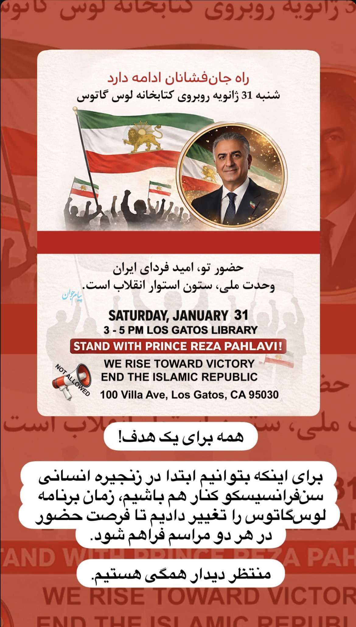 Payam Javan: A significant community gathering and protest has been announced for Saturday, January 31, in Los Gatos, California. The event aims to amplify the voices of the Iranian people and demonstrate international solidarity with the ongoing domestic struggles against the current regime.