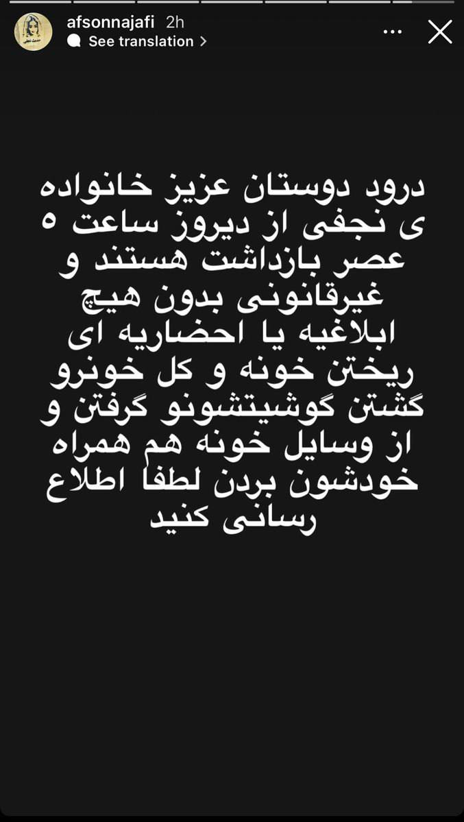 پیام جوان: افسون نجفی، خواهر حدیث نجفی، از معترضان در خیزش ۱۴۰۱ ایران که در مهرشهر کرج توسط نیروهای جمهوری اسلامی به قتل رسید و شبانه به خاک سپرده شد، در قالب یک استوری اسنستاگرامی، از بازداشت اعضای خانواده خود توسط نیروهای امنیتی جمهوری اسلامی خبر داد.