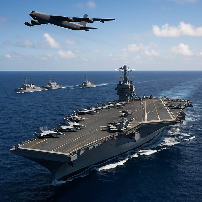 Payam Javan: Newly released images from U.S. Southern Command show the Gerald R. Ford Carrier Strike Group maneuvering powerfully through the Western Atlantic—one of the strongest visual markers yet of the renewed American military presence President Donald Trump has ordered in the region. The photos capture a B-52 Stratofortress soaring above the fleet and U.S. destroyers operating in tight formation, underscoring an unmistakable message of readiness and resolve. SOUTHCOM emphasized that the group provides “presence with purpose,” aimed at deterring criminal networks and reinforcing homeland defense.